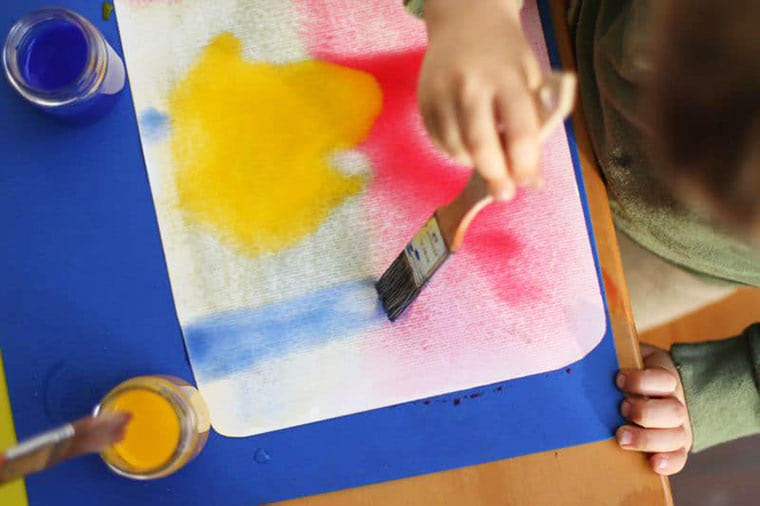 This kind of painting was set up in a very deliberate way to allow the children to dive into the colors, live in the fluidness of this special kind of paint on watery paper, be fully in their feeling-space. Which is the place where 4 year olds actually are at home.